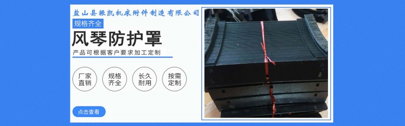 盐山县振凯机床附件制造有限公司,为机床附件专业生产单位,东临渤海,有便利的205国道,西有畅通的京沪、 京九铁路,坐落在美丽的漳卫新河畔,我公司 依靠高科技开发产品,企业充满活力,产品广泛用于外各种机床、和设备的维护上。我公司主要产品:机械防护罩;数控机床防护罩;柔性风琴式机床导轨防护 罩;钢板式机床导轨防护罩;丝杠防护罩;油缸防护罩;汽缸防护罩;耐高温防护罩;盔甲式防护罩;焊接防护罩;螺旋钢带防护罩;风琴式防尘折布防护罩;医疗 器械防护罩;精密仪器防护罩;升降机防护罩;铝型防护帘;托架式卷帘防护罩;盒式卷帘防护罩;自动伸缩式钢带;机床排屑机;还有可调塑料冷却管;导轨刮屑 板;DGT型导管防护套;JR-2矩形金属软管;工程塑料拖链;钢铝拖链;尼龙软管等机床附件产品。在每一个产品的背后又有多种型号供您选择。尤其是公司 生产的柔性风琴式防护罩,丝杠防护罩具有防尘、防水、防油、防乳剂和化学药品,耐拉伸、撞击不变形、耐腐蚀、使用寿命长等特点,产品配套机床出口到十几个 地区。公司可根据客户需要,也可按照各类异型产品的设计加工生产。