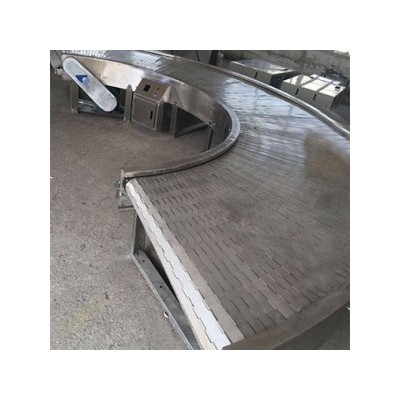 链板输送机以标准链板为承载面,由马达减速机为动力传动;我们可以通过多列链板并行,使链板输送机做的很宽并形成差速,利用多列链板的速度差使多列输送在无挤压的情况下变为单列输送,从而满足饮料贴标、灌装、清洗等设备的单列输送的要求,我们可以将两条链板输送机的头尾部做成重叠式的混合链使得瓶(罐)体处于动态过度状态,使输送线上不滞留物料,可以满足空瓶以及实瓶压力和无压力输送。